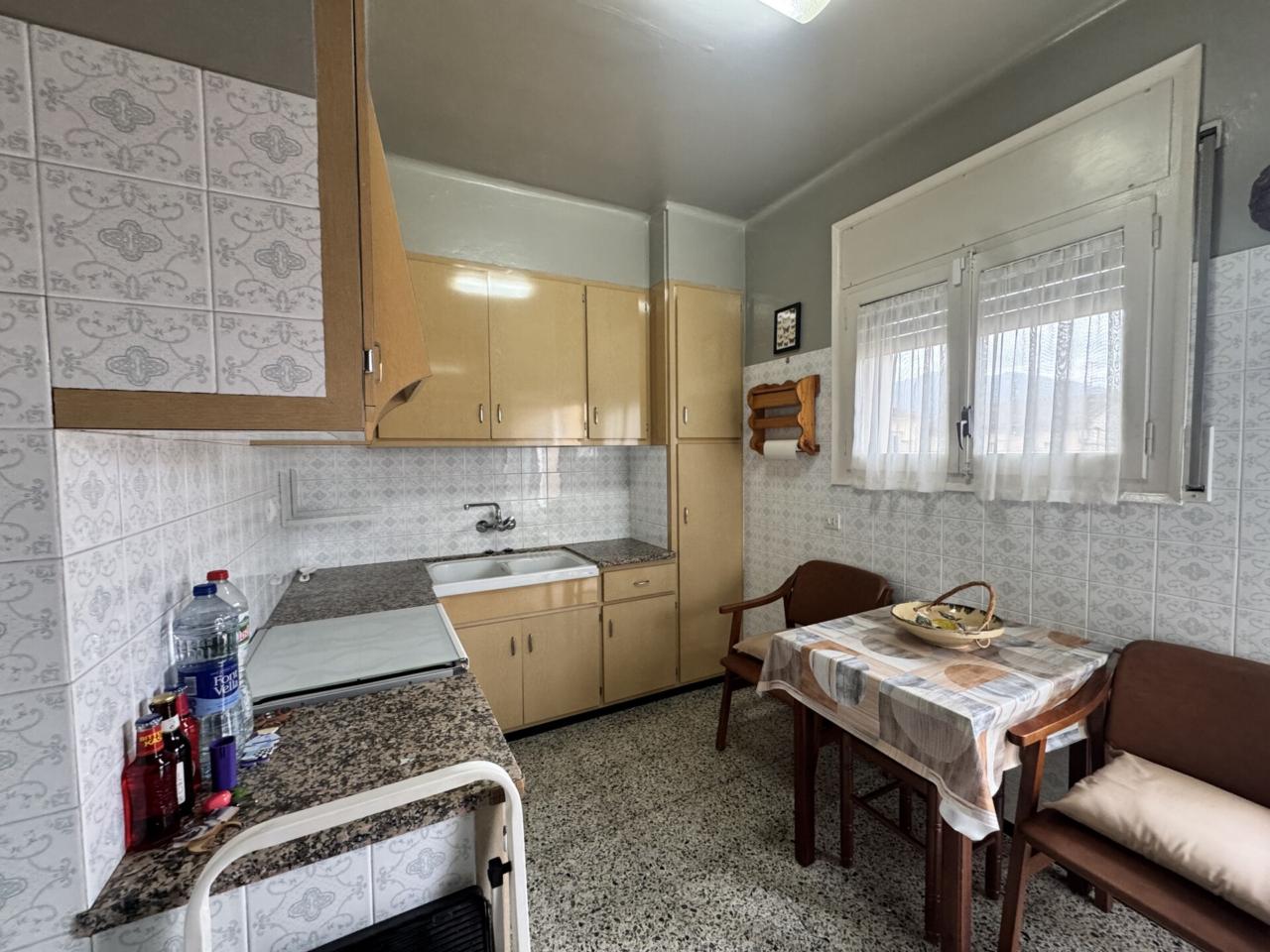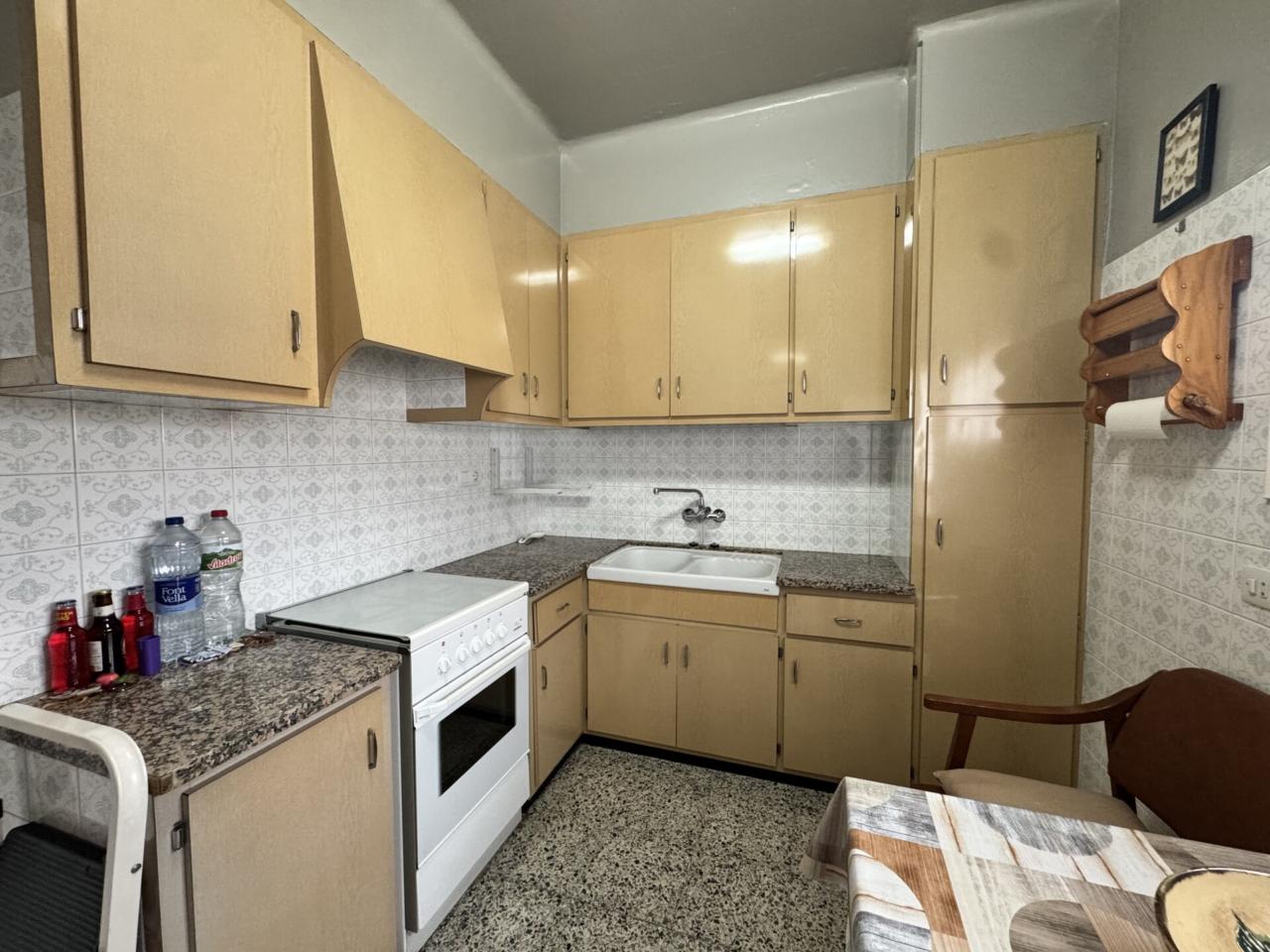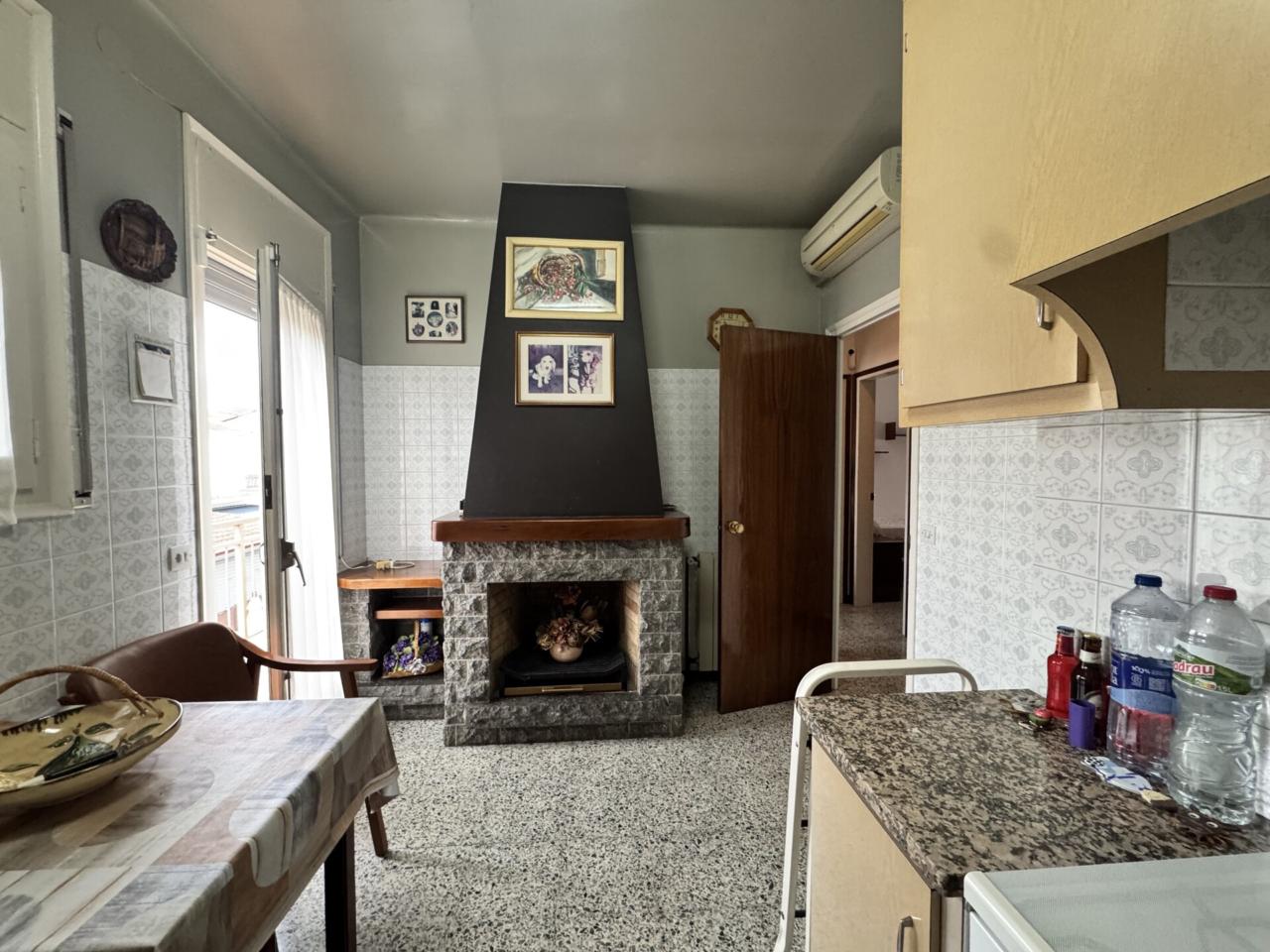 La planta primera acull la zona d’habitatge, distribuïda en tres habitacions (dues dobles i una individual), una cuina independent amb llar de foc que aporta calidesa i caràcter, un bany complet amb plat de dutxa i un ampli menjador-sala d’estar molt lluminós. Des d’aquesta planta s’accedeix a un gran balcó que s’estén de punta a punta de la façana, proporcionant llum natural i ventilació.